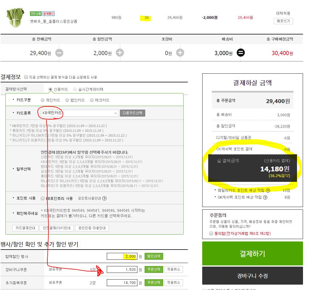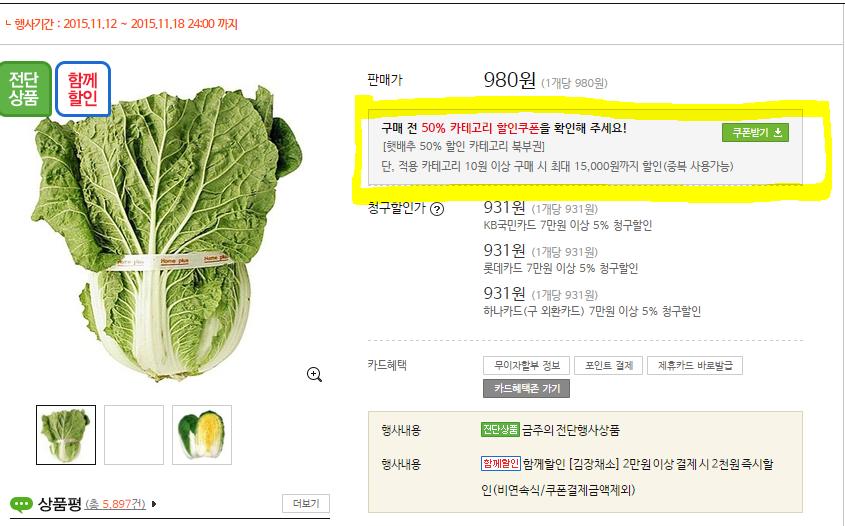 (김장채소2만원이상 2천원) 에누리 + (각종 카드쿠폰 3만원이상 5%) 에누리 + 50퍼쿠폰 = 트리플 에누리