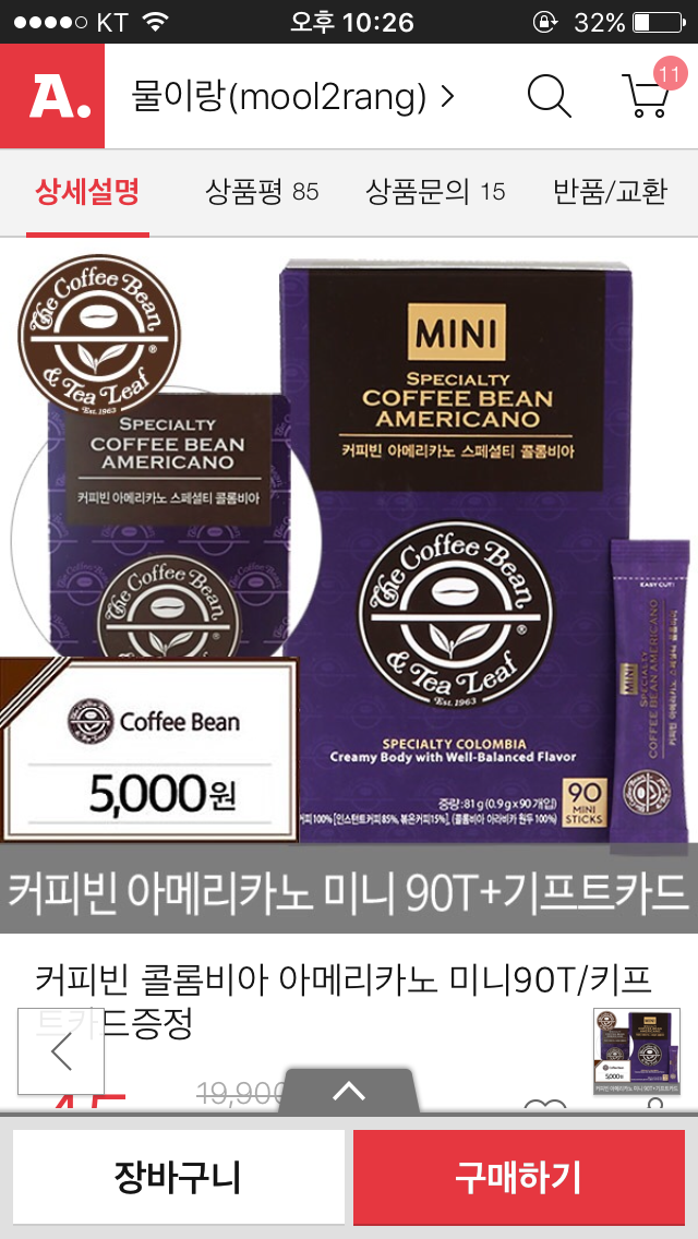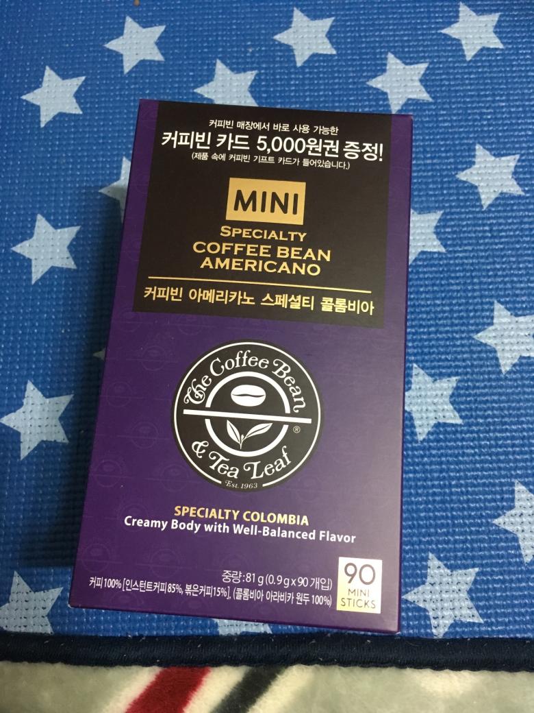 미니사이즈 0.9g짜리 커피 90개 들어있고 박스 안에 커피빈에서 쓸 수 있는 기프트카드가 동봉되어 있습니다