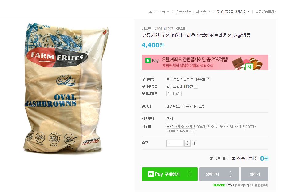 기존 코스트코 해쉬브라운생각하고주문했는데ㅠ약간향이 이국적인향이 있어요 팜프리츠제품 다 맞있는데 이건 좀 못먹겠더라구요 | ||