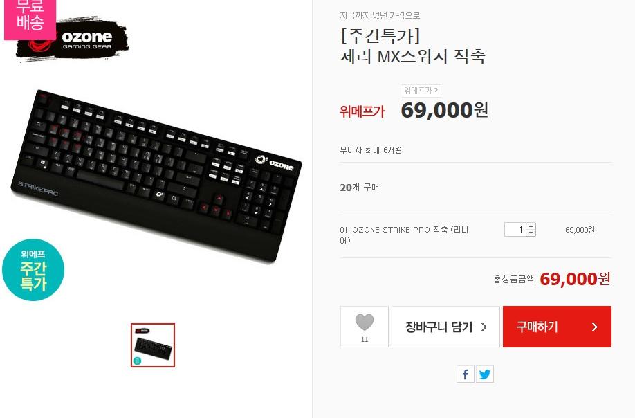 위메프 주간특가에서 오존 스트라이크 프로 적축 기계식 키보드를 69000원에 세일중입니다 !!