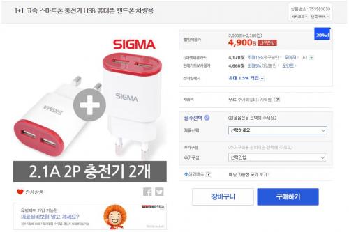 [G마켓]SIGMA 2.1A 2포트 고속 충전기 1+1 (4,900원/무료)