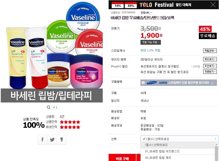[옥션] 바세린 립밤 1개 (1,900/무료) > 국내핫딜