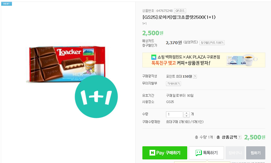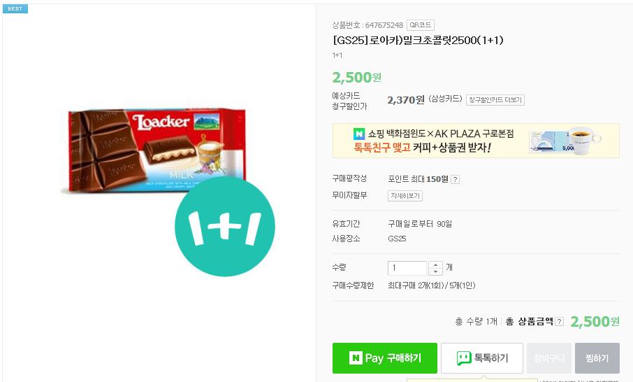 이거는 그냥 gs25행사죠.. 11번가에서 1,250원인가에 풀린게 진짜 싼거죠 ㅋㅋ 1+1= 1,250 임 |