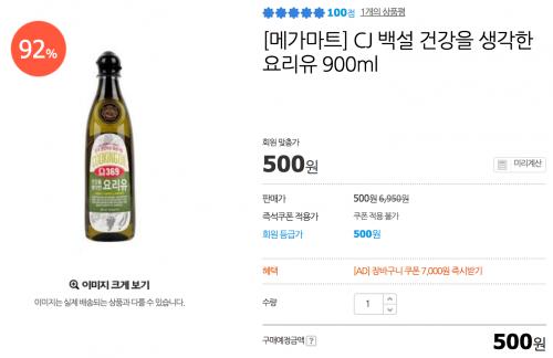 [동원몰] CJ 백설 건강을 생각한 요리유 900ml (500원/2,500원) > 국내핫딜