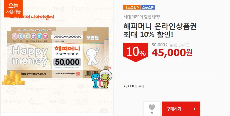 [위메프] 해피머니 5만원권 (45,000원/무료) > 국내핫딜