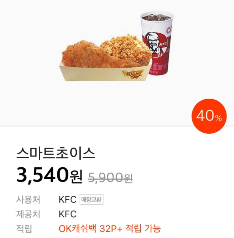 [시럽테이블앱] KFC 스마트초이스(치킨2조각+콜라M) 40% (3,540/무료)