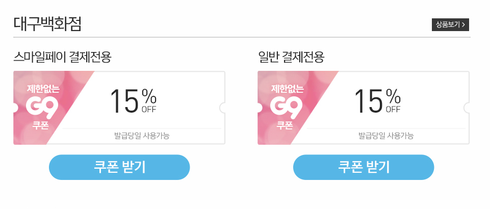 먼저 링크에서 대구백화점 현대카드 15% 할인쿠폰을 받습니다.(스마일페이/논스마일페이 쿠폰 모두 가능)