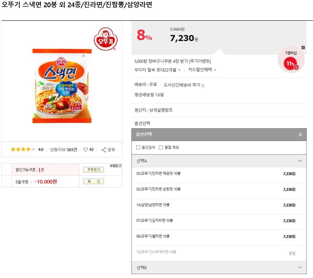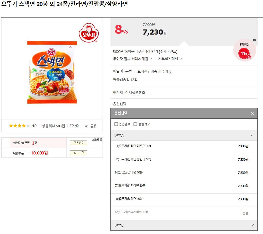 감사합니자. 진라면 순한맛으로 20개 샀어요^^
