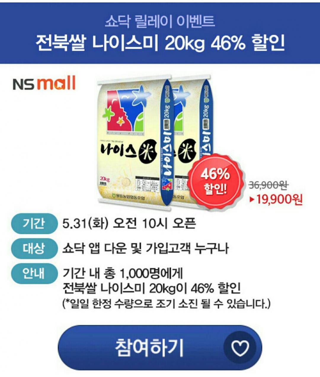쌀 20kg짜리인데요 할인을 무려 46%! 일반 쌀도 아니고 전북 나이스미인데 19,900원에 팔고있어요ㅋ