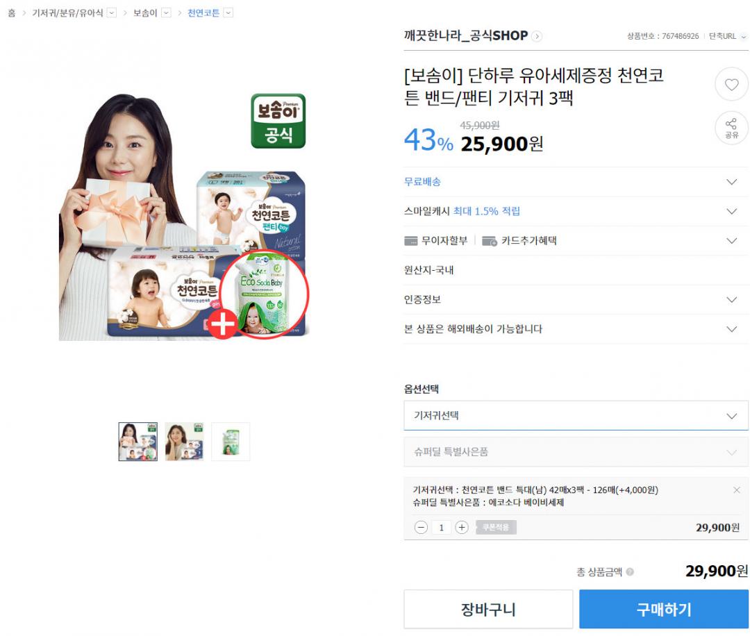 [G마켓] 보솜이 단하루 유아세제증정 천연코튼 밴드/팬티 기저귀 3팩 (25,900~29,900원/무료배송) > 국내핫딜