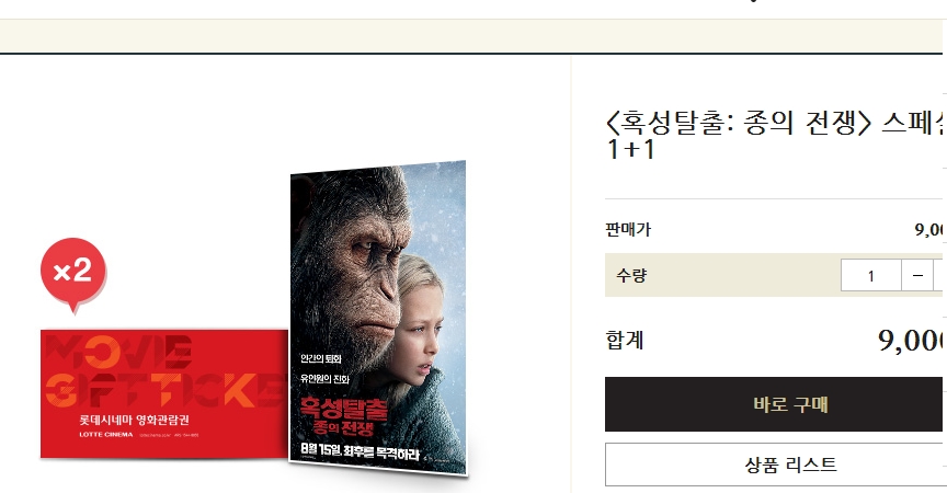 [롯데시네마] 혹성탈출 1+1 (9000/0)