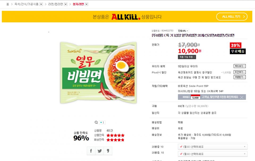 [옥션] 삼양 열무비빔면 20봉 (10,900/무료) > 국내핫딜