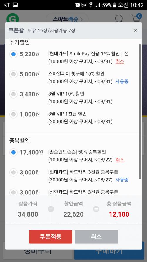 스마일페이 사용안하더라도 50% 쿠폰이 중복쿠폰이라 갖고계신 10% 쿠폰이나 기타 쿠폰 적용하면 평소가격보다 많이 저렴할듯하고