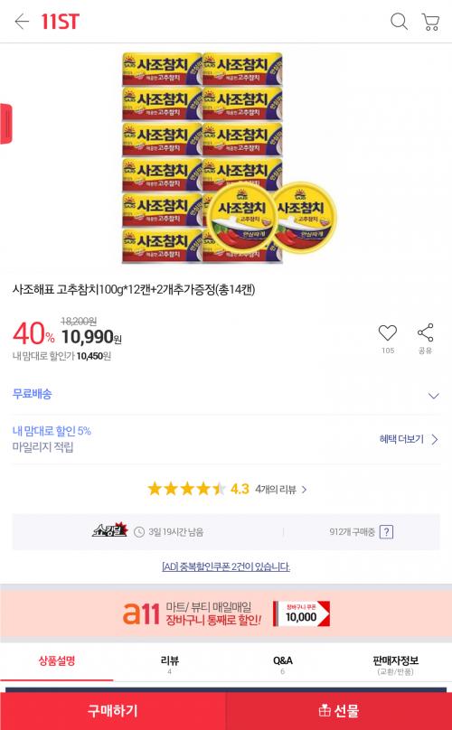 [11번가] 사조참치 고추참치 14개 (10,990/무료)