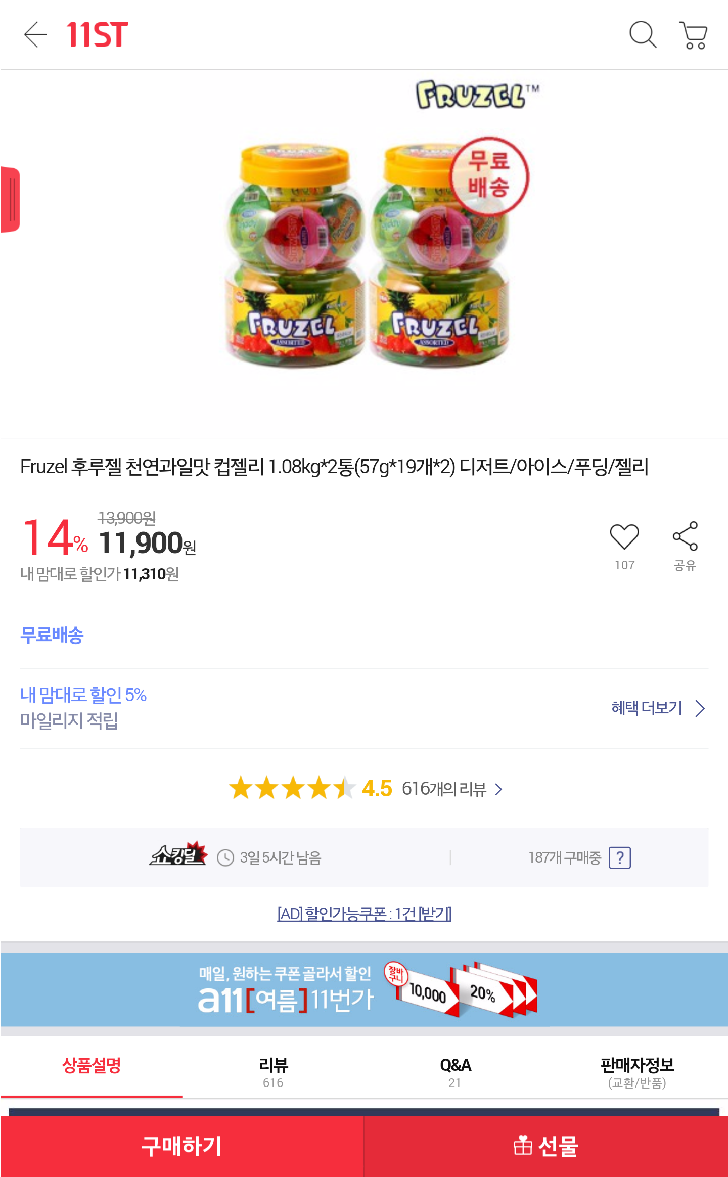 [11번가] 후루젤 1.08kg*2 (11,900/무료)