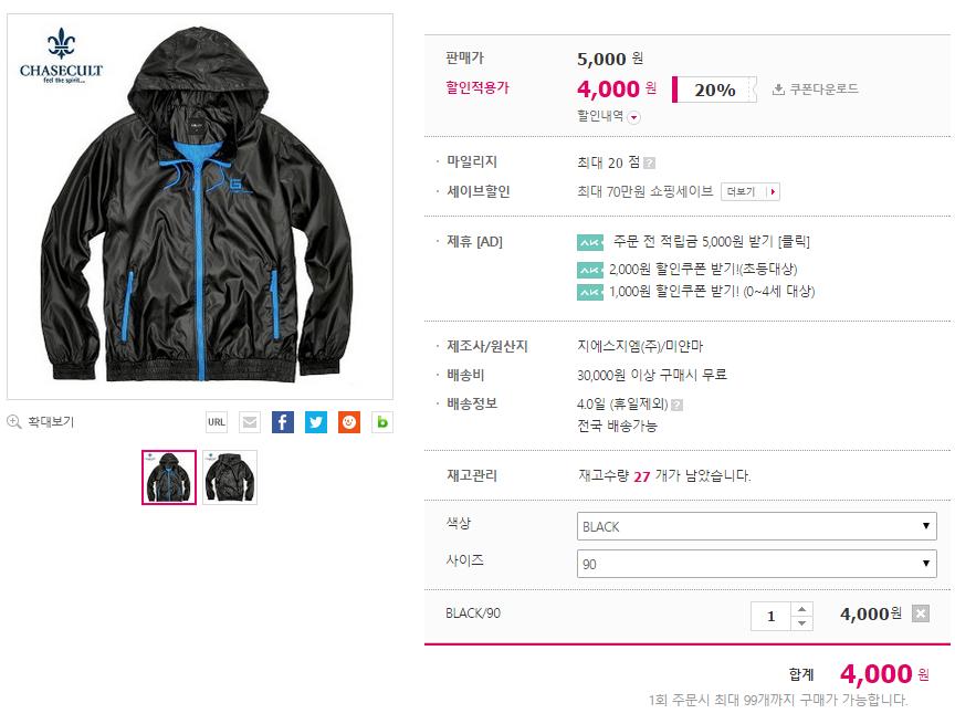 [체이스컬트]남성용 후드내장형 배색 바람막이 점퍼-AARK4101B30