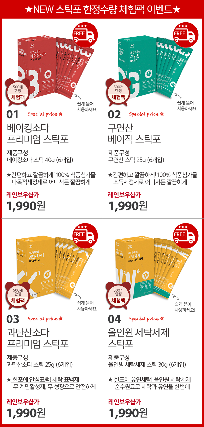 [11번가] 레인보우샵 베이킹소다, 구연산, 과탄산소다, 세탁세제 각 6회분량 (1,990 원 / 무료) > 국내핫딜