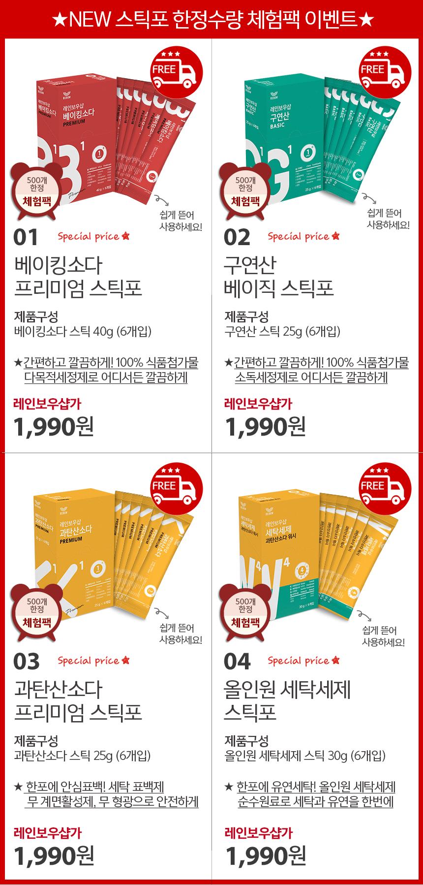 [11번가] 레인보우샵 베이킹소다, 구연산, 과탄산소다, 세탁세제 각 6회분량 (1,990 원 / 무료)
