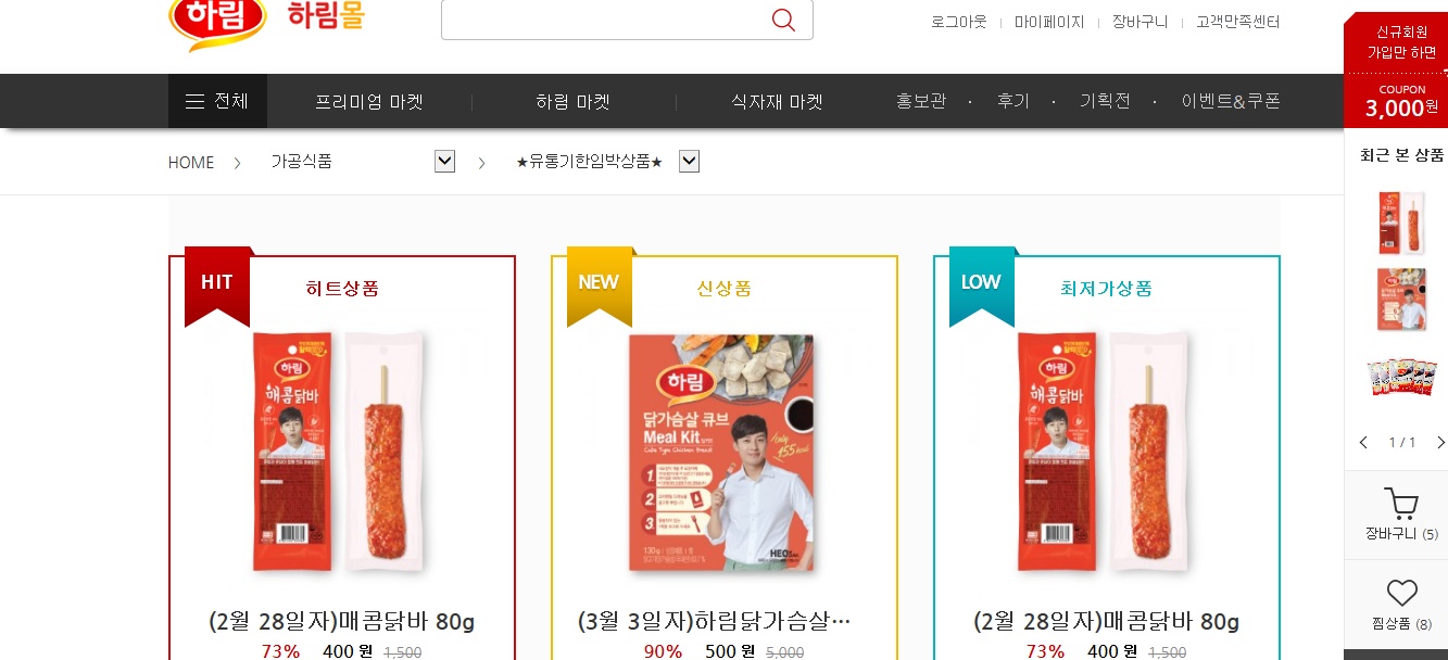 [하림몰](2월28일)매콤닭바80g 400/3000 > 국내핫딜
