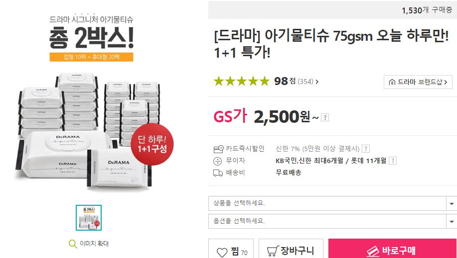 [GS Shop] 드라마 아기물티슈 75gsm 체험팩 (2,500/무료) > 국내핫딜