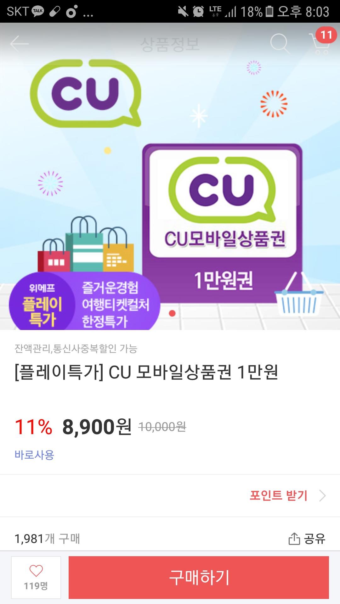 [위메프] [플레이특가] CU 모바일상품권 1만원 (8,900원/무료)