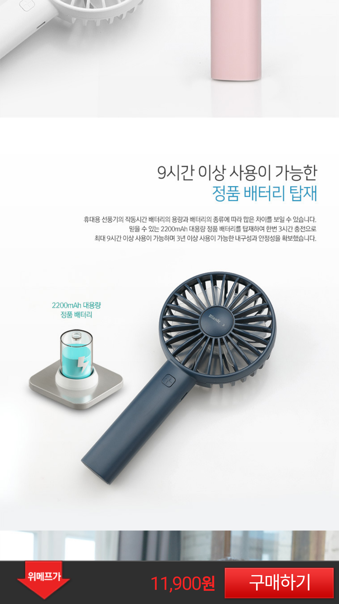 배터리는 2200이고 사용시간은 대략 약풍으로 9시간 정도 간다고 합니다. 모리츠보단 짧네요.