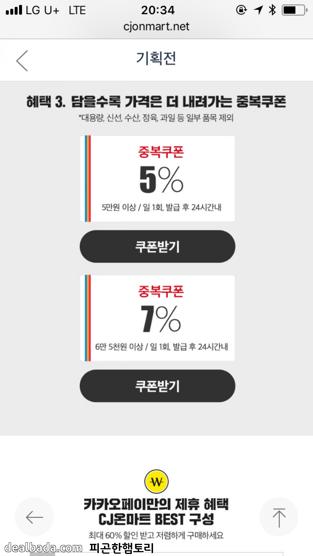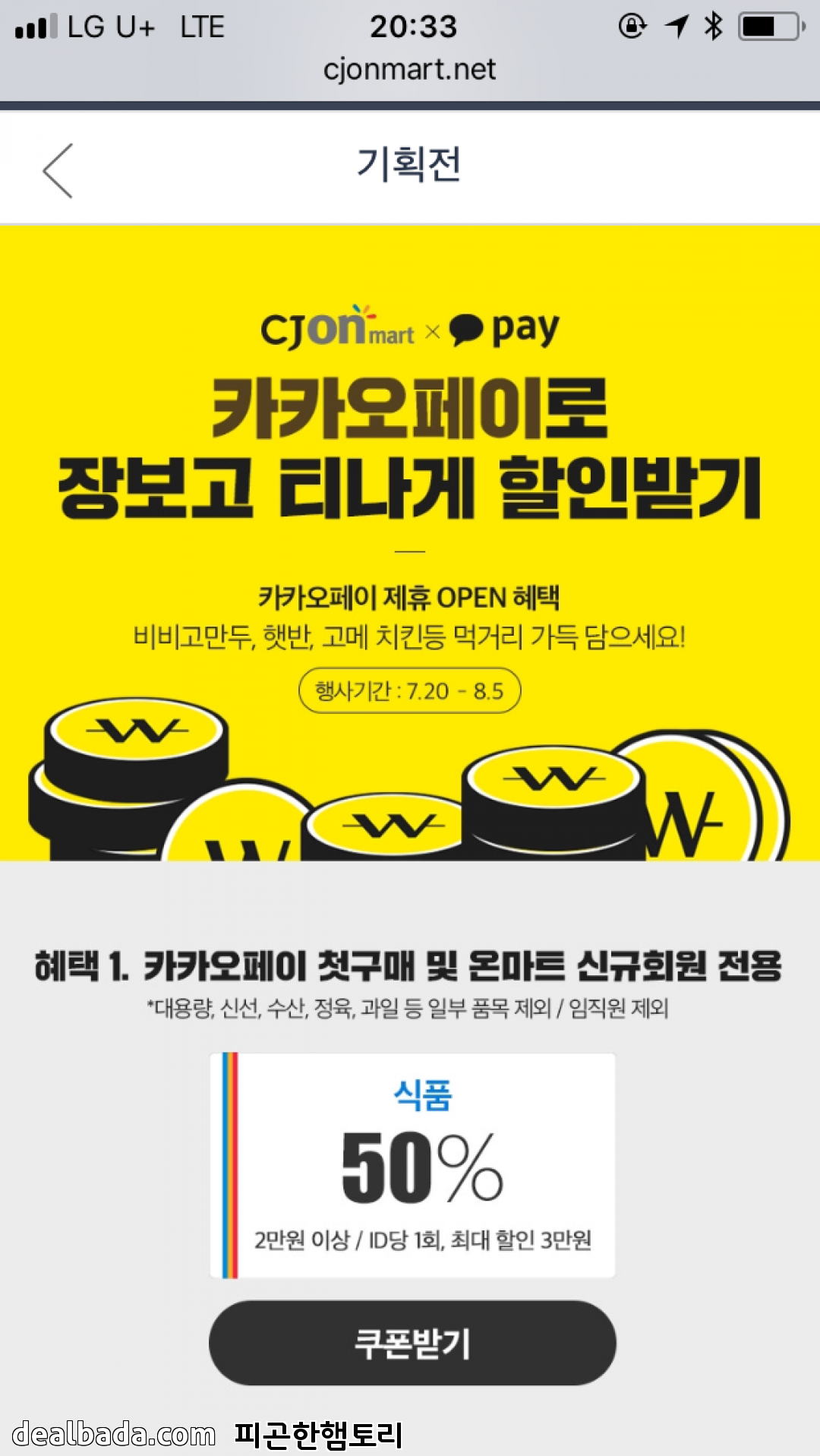 이후 메인 링크에 들어가셔서 카카오페이 전용 50% 쿠폰과 중복 5% 쿠폰을 받습니다