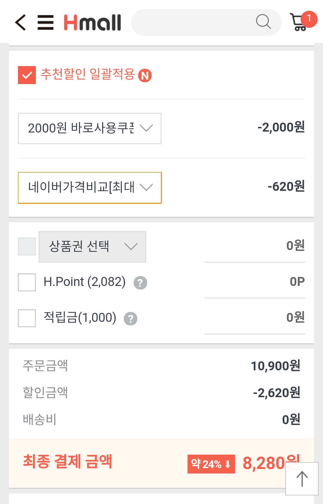 장바구니에 담으시고 아래 링크에서 현대몰 상품