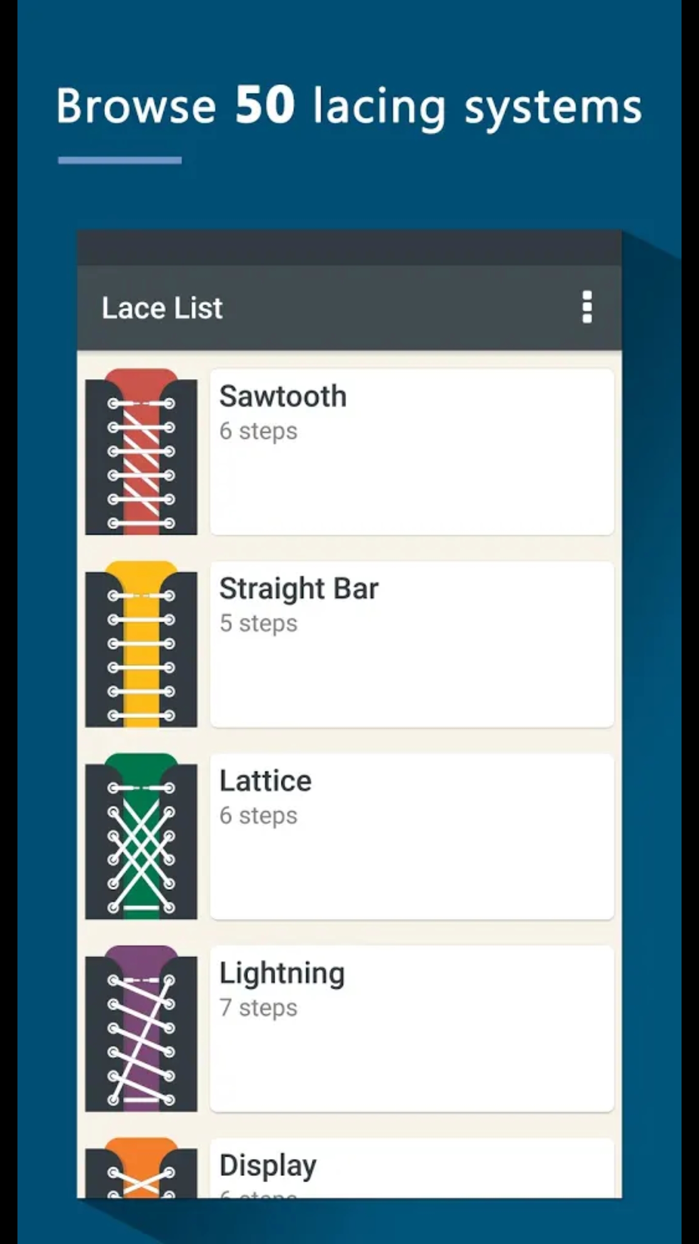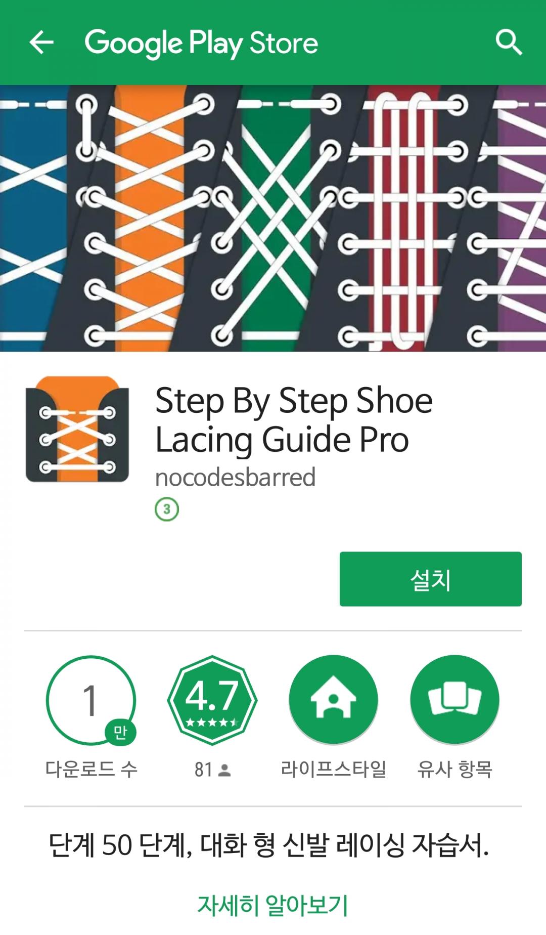 사진 보시면 알겠지만 실발끈 묶는 법을 알려주는 앱입니다. 다운로드 수도 적당히 많고 평도 괜찮은 편이네요^^