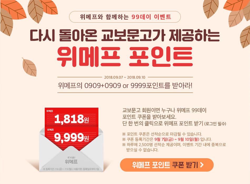 교보문구에서 이번달에도 위메프 99데이 1818 or 9999 포인트 받을수 있는 쿠폰이 나왔습니다.
