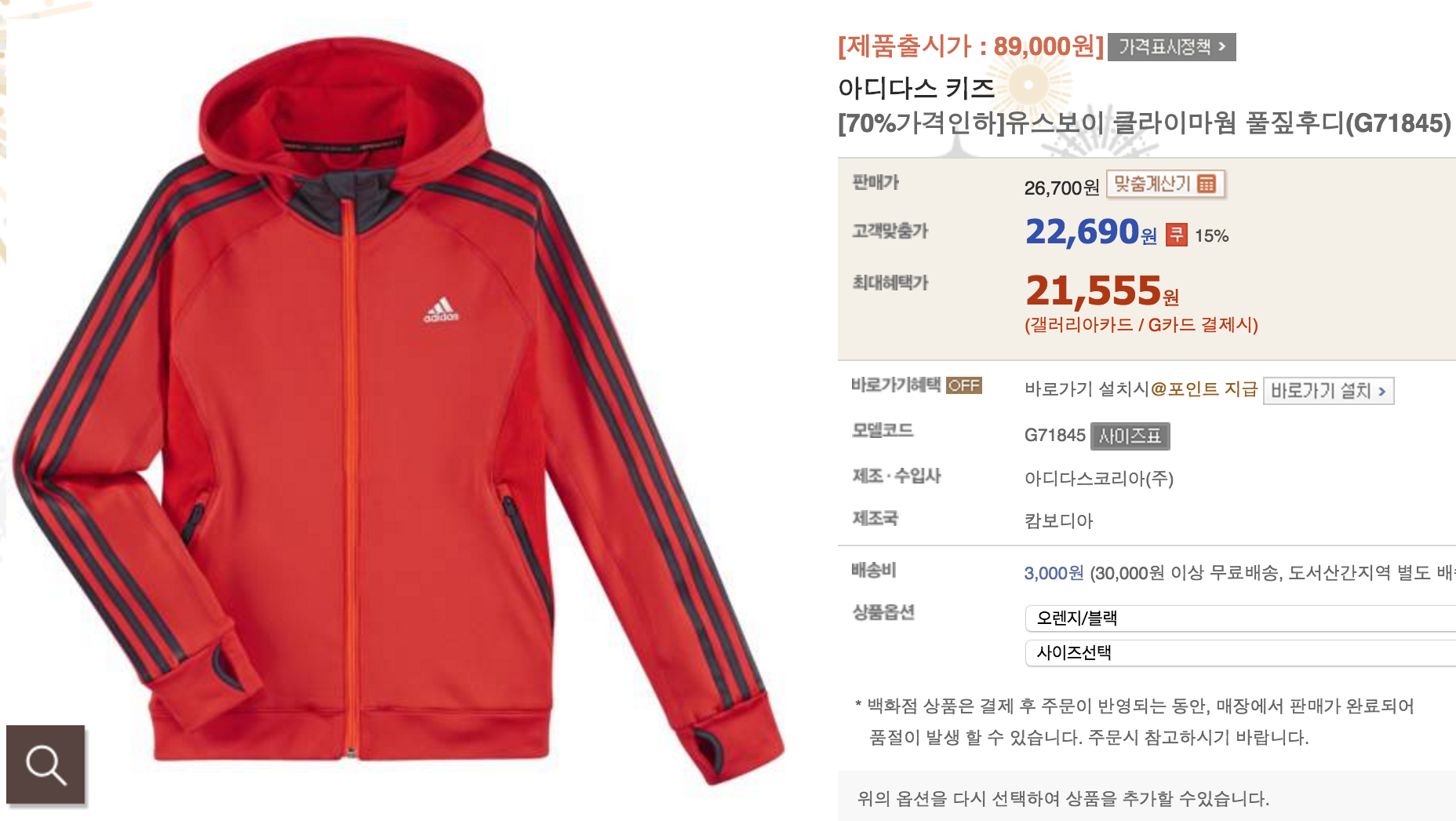 [갤러리아몰] 아디다스 키즈 유스보이 클라이마웜 풀짚후드 (22,690원/3,000원)