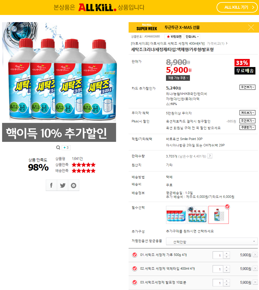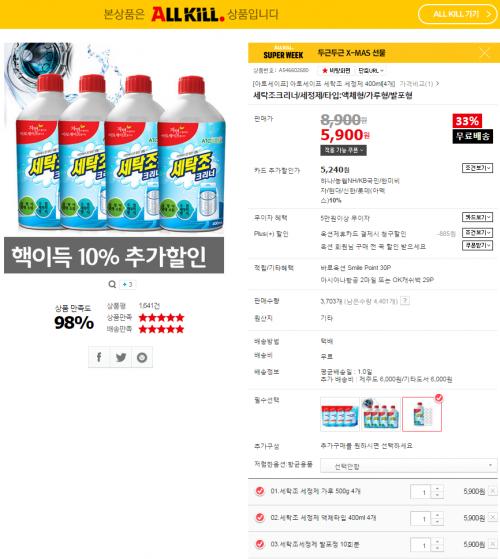 [옥션] 세탁조크리너400ml 4개 외 2건 (5,900원/무료)