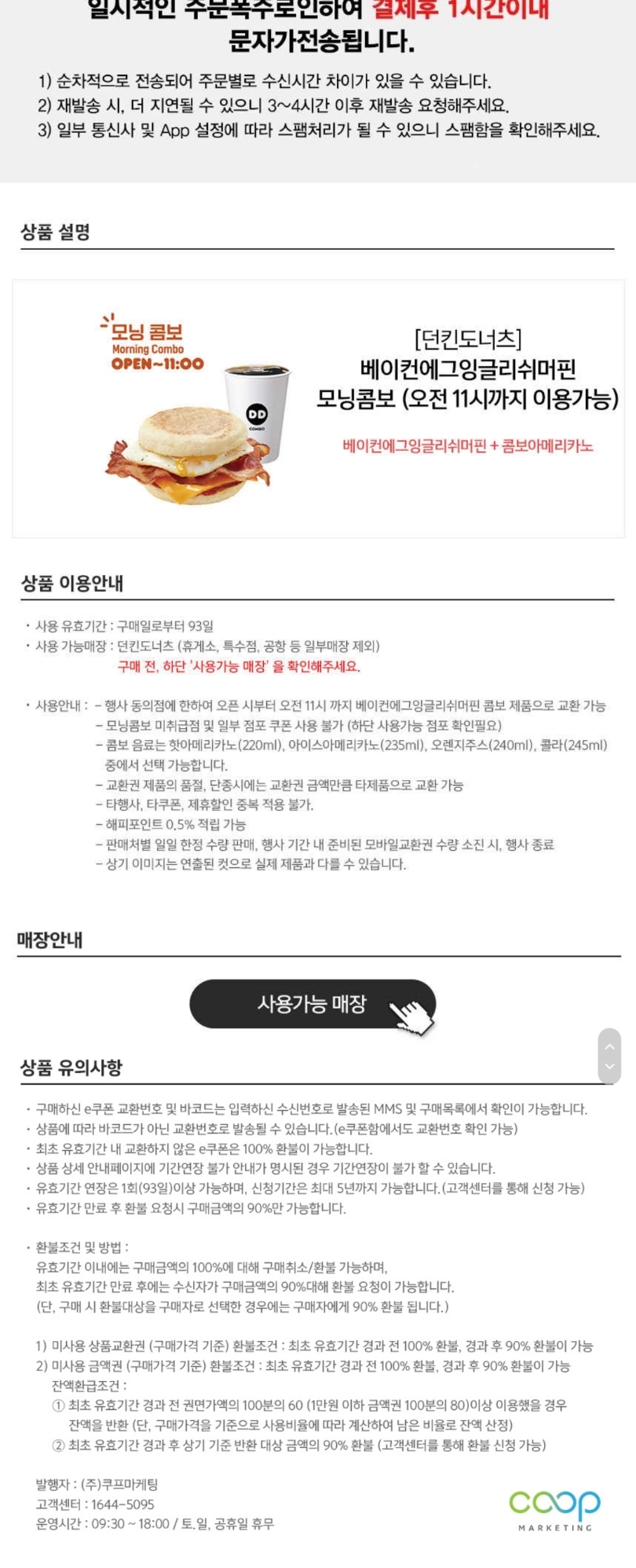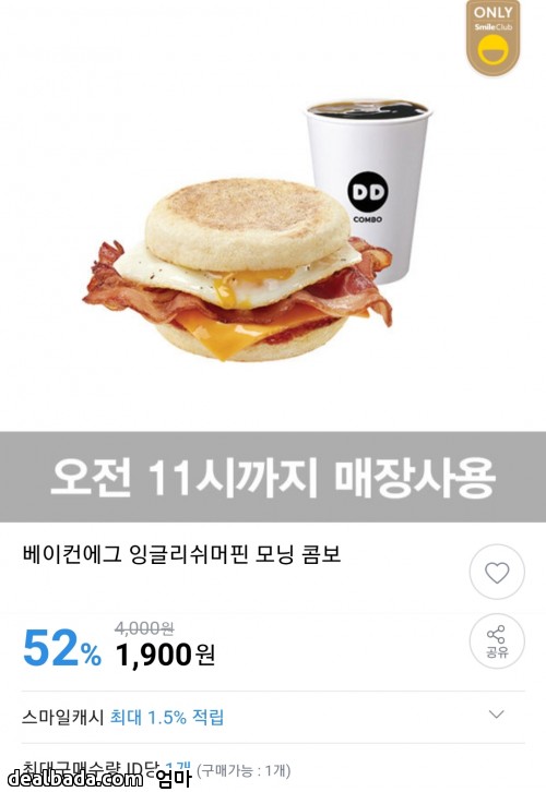[G마켓]스마일클럽 던킨 베이컨에그 잉글리쉬머핀 콤보(1,900) > 국내핫딜