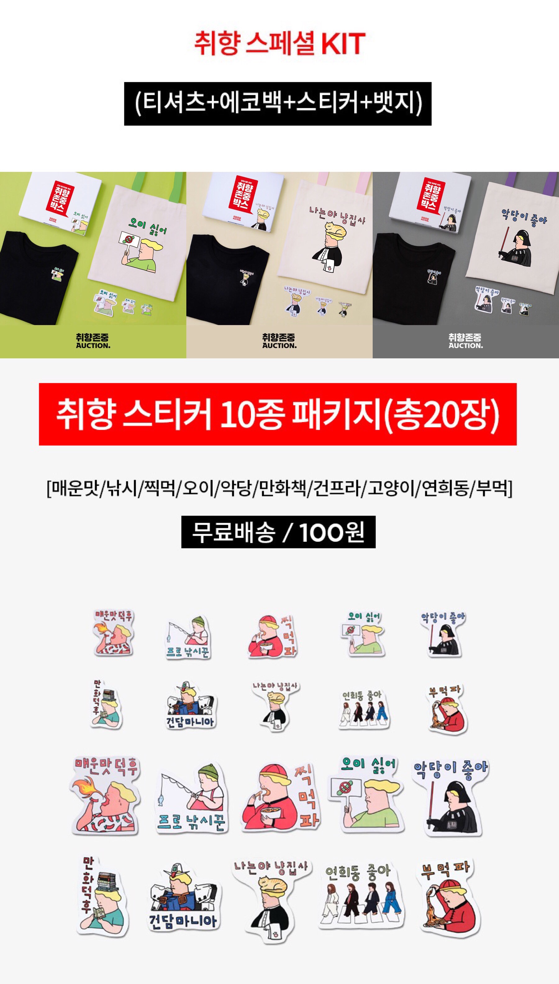 [옥션스마일클럽] <티셔츠+에코백+스티커+뱃지>취향 스페셜 키트 (3,000원/무료) > 국내핫딜