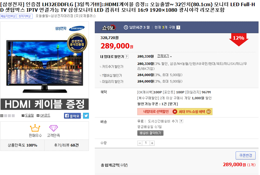 모니터로 쓰기에는 해상도가 1920*1080이라 비추이고, iptv용으로 무난해보이네요.