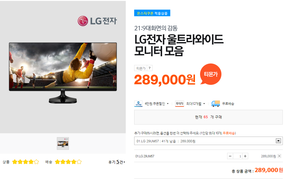 [티몬] LG전자 울트라와이드 모니터 29UM57 (289,000원/무료)