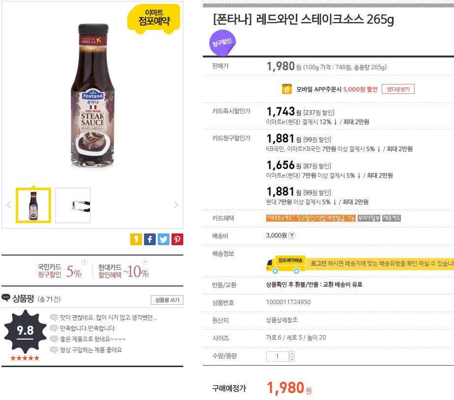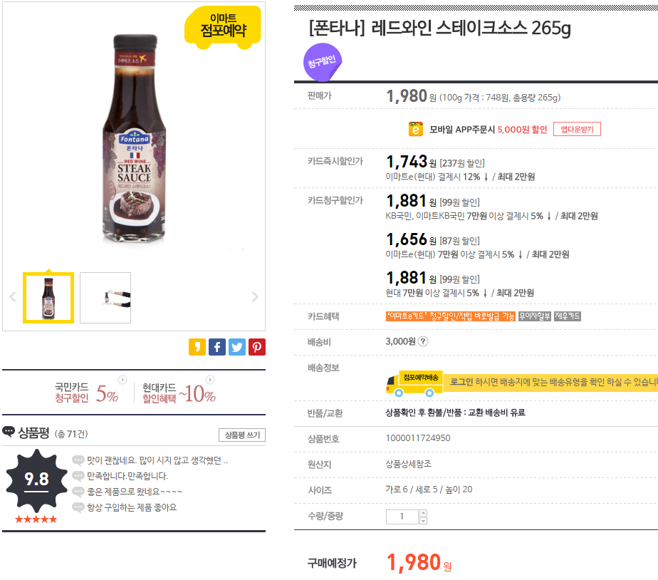 [이마트몰] 폰타나 레드와인 스테이크소스 265g (1,980원/3,000원) > 국내핫딜