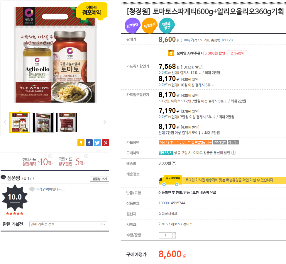 [이마트몰] 청정원 토마토스파게티600g+알리오올리오360g (8,600원/3,000원) > 국내핫딜