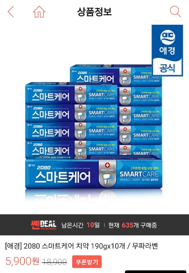 [쇼닥] 2080 스마트케어 치약 190g*10개 (5,900/0) > 국내핫딜