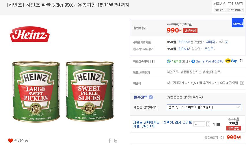 [G마켓] 하인즈 라지(통오이) 피클 3.3kg 유통기한임박 (990원/2,500원) > 국내핫딜