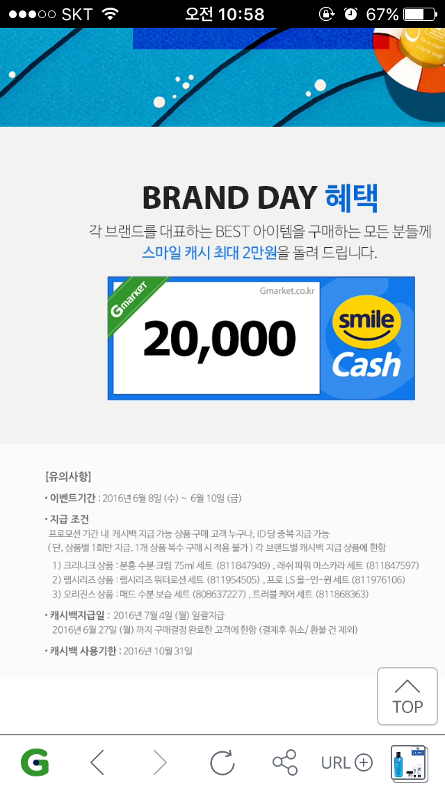 사려고 했더니 스마일캐시는 7월4일에 일괄증정이라 추후에 다른제품을 살때 유리하겠네요