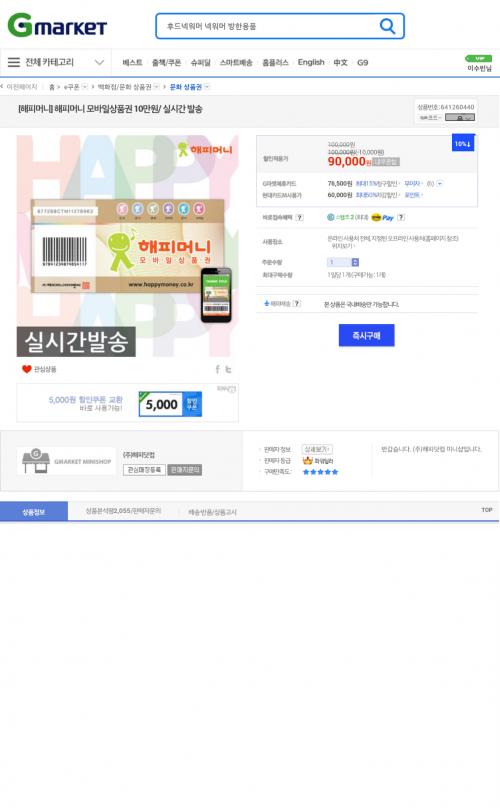 [G마켓] 해피머니 모바일상품권 10만원 (90,000/MMS) > 국내핫딜
