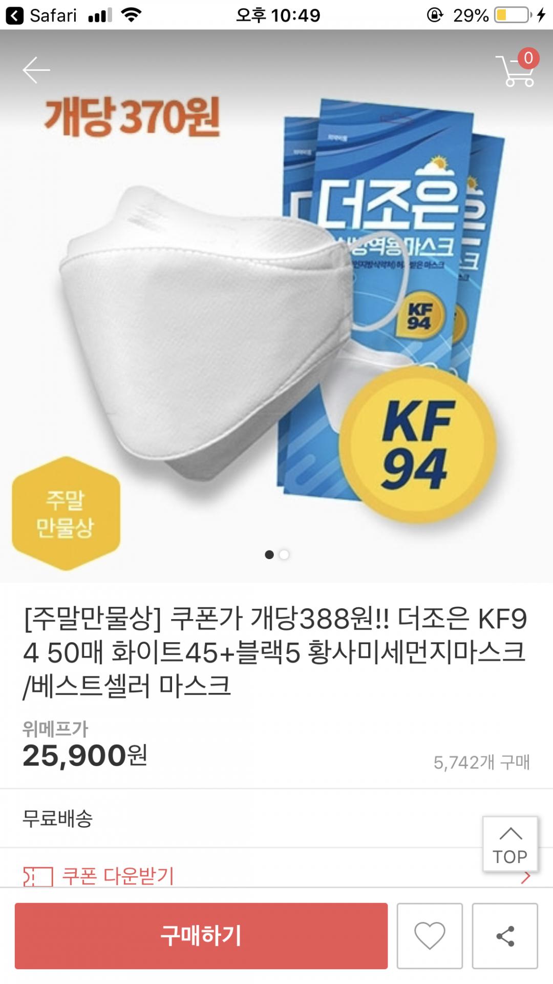 [위메프] 더조은 K94 마스크 50매 (19,430원/무배)