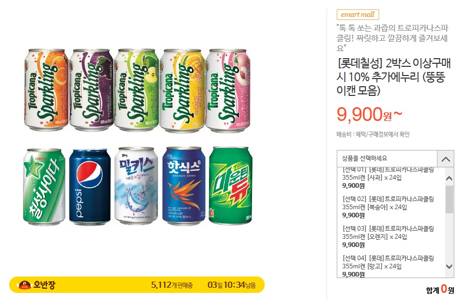 [이마트몰] 트로피카나 스파클링 355ml캔*24입(9,900/무료) > 국내핫딜