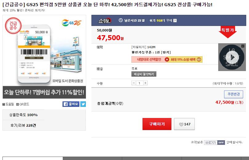 [11번가] GS25편의점 5만원 상품권 (42,500/무료) > 국내핫딜