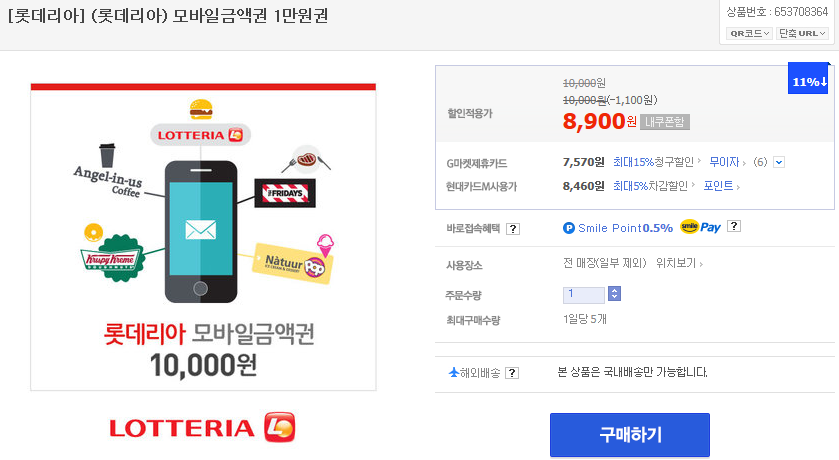 [G마켓] 롯데리아 모바일금액권 1만원권 (8,900원) > 국내핫딜