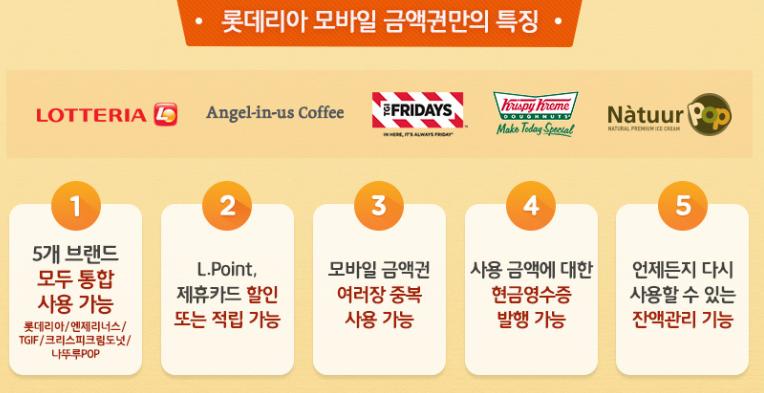 롯데리아 모바일 상품권 아래 내용을 보면 중복사용, 적립, 현금영수증 발행까지 가능하네요.