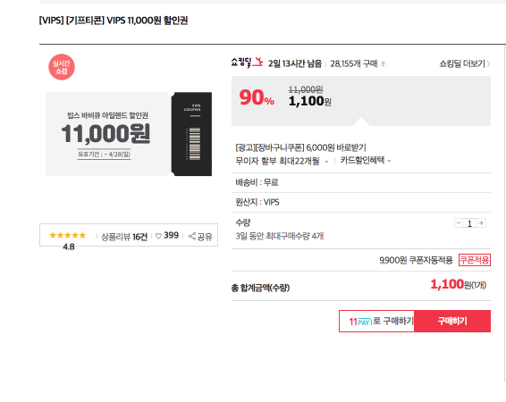 [11번가] 빕스 할인권 11,000원 (1,100원 / 무료)