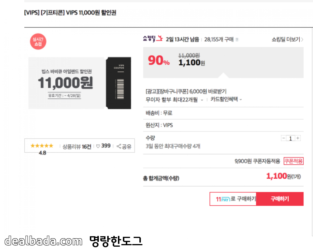 [11번가] 빕스 할인권 11,000원 (1,100원 / 무료) > 국내핫딜