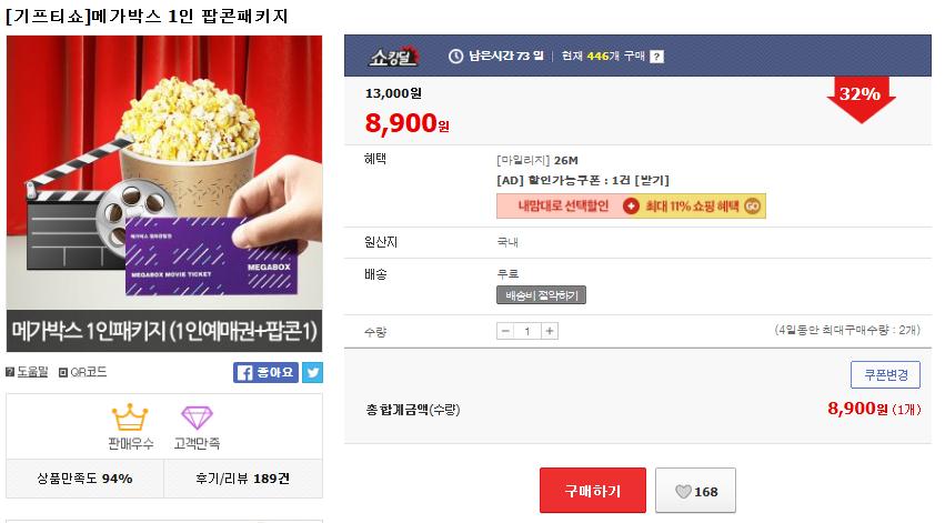 [11번가] 메가박스 1인 팝콘패키지 (8,900/무료) > 국내핫딜